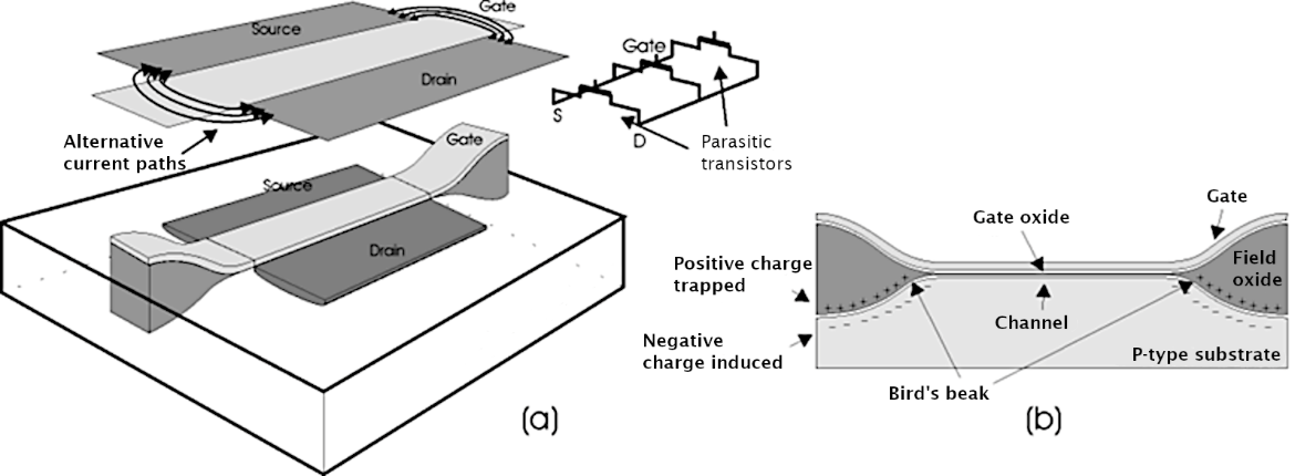 The two regions, referred to as the bird’s beak (figure 2.9 (b)), located at the sides of the gate region between the polysilicon and the substrate, are particularly effective in creating alternative current paths between the source and drain. However, inversion can even occur directly beneath the field oxide at high levels of irradiation.