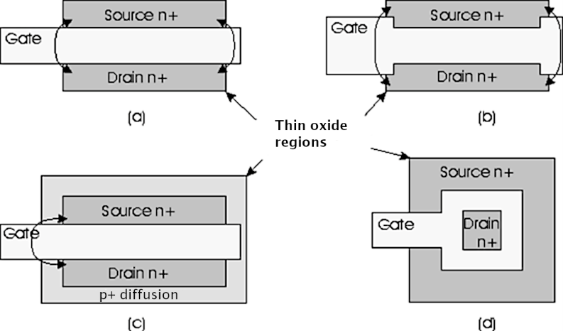 Figure 2: Layout techniques to reduce leakage current shown in (a): lengthening the gate of parasitic devices (b), increasing the distance between the field oxide region and the gate (c), and using ELT design (d).